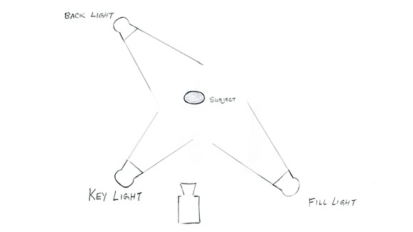 3-Point lighting is a lighting technique utilizing three lighting instruments; a Keylight, Backlight and Fill Light. The light sources are placed approximately in a placement representing the 3 corners of triange surrounding the subject (when referring to a diagram viewed from above). The Keylight is most often the brightest light source. The backlight only effects the back of the subject and the Fill light adds to dark areas to "fill" in shadowed areas.
