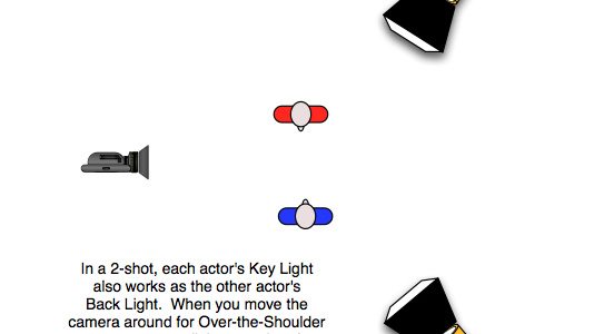 Each individual light acts a keylight for one actor and also as a backlight for the other actor.
